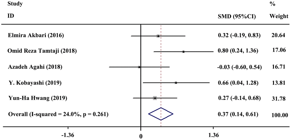 Five studies included 154 subjects in the probiotics group and 143 subjects in the control group. A fixed-effects model was selected for quantitative synthesis. In general, the result of meta-analysis revealed a significant difference between the probiotics and control group regarding improvement in cognition (SMD = 0.37; 95% CI, 0.14, 0.61; P = 0.002; I2= 24%). The forest plot of the meta-analysis is shown in Figure 3.