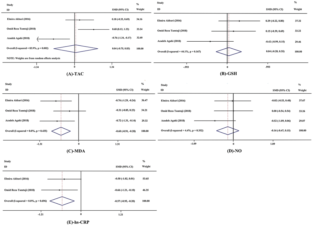 Meanwhile, fixed-effects models were applied to meta-analyses of malondialdehyde (MDA), high-sensitivity C-reactive protein (hs-CRP), total glutathione (GSH) and nitric oxide (NO) on account of acceptable heterogeneity among studies, while a random-effects model was selected for analysis of total anti-oxidant capacity (TAC). The results showed significant decrease in levels of MDA (SMD = −0.60; 95% CI, −0.91, −0.28; P = 0.000; I2 = 0.0%; n = 3 studies; n = 82 subjects) and hs-CRP (SMD = −0.57; 95% CI, −0.95, −0.20; P = 0.003; I2 = 0.0%, n = 2 studies, n = 57 subjects). And no significant differences were observed in TAC (SMD = 0.04; 95% CI, −0.75, 0.83; P = 0.919; I2 = 83.9%, n = 3 studies; n = 82 subjects), GSH (SMD = 0.04; 95% CI, −0.28, 0.35; P = 0.822; I2 = 44.1%; n = 3 studies; n = 82 subjects), and NO (SMD = −0.16; 95% CI, −0.47, 0.15; P = 0.316; I2 = 4.4%; n = 3 studies; n = 82 subjects) between the probiotics and control group. The forest plots of these meta-analyses are shown in Figure 4.