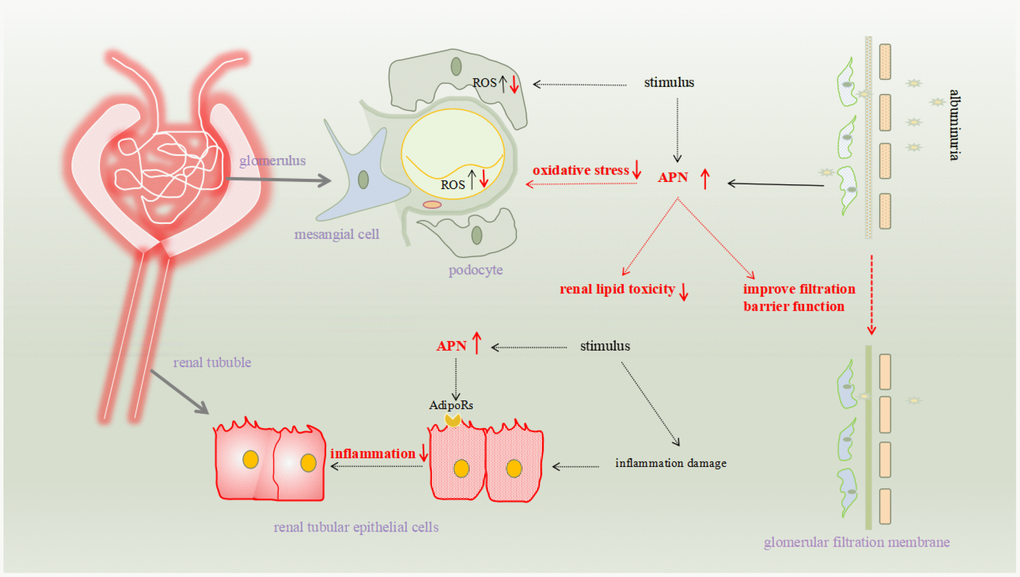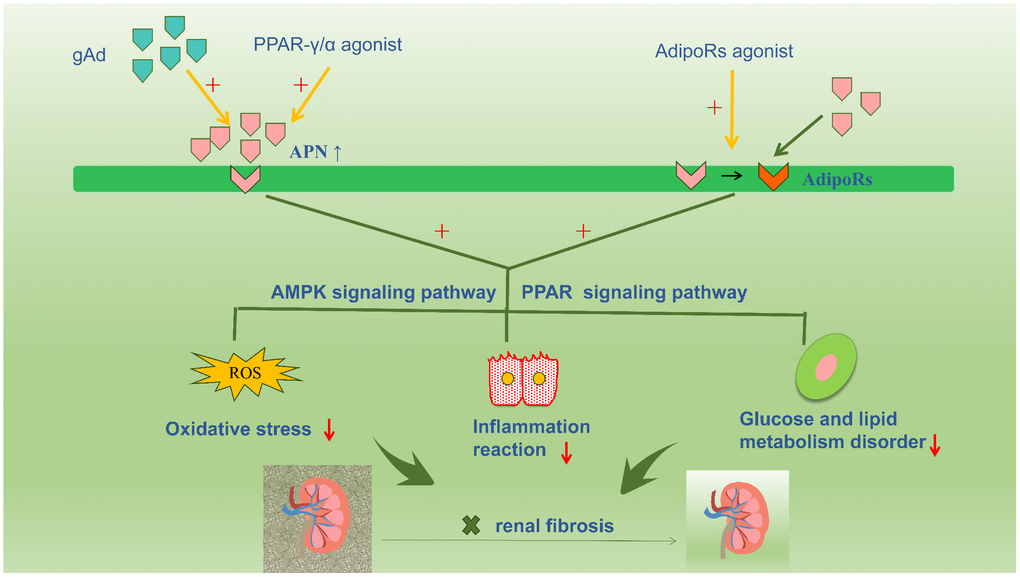 The pathomechanism of renal fibrosis involves several factors, including oxidative stress and related inflammation, disturbances of glucose metabolism, and hemodynamic abnormalities. Many studies have confirmed that APN is involved in reducing renal fibrosis, and its specific mechanisms include reducing renal toxicity, reducing renal cell damage, resisting fibrosis, and reducing proteinuria to protect the glomerular filter (Figure 1).