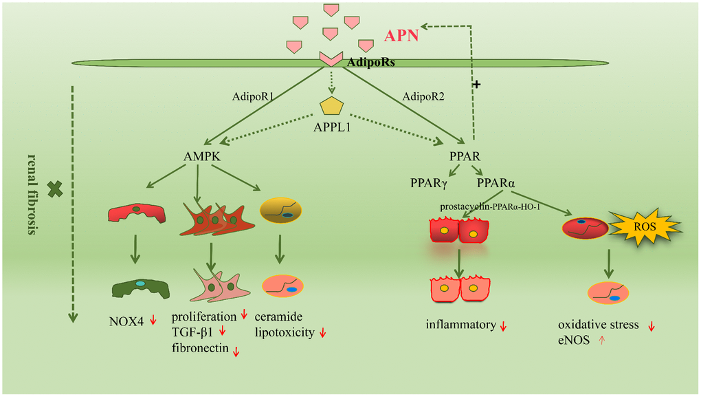 Previous studies have shown that elevated glucose levels increase the mammalian target of rapamycin (mTOR) expression, and overexpression of the mTOR protein can cause kidney injury. Based on in vitro experiments, Sajjad Esmaeili et al. confirmed that APN reduces oxidative stress and associated kidney cell injury by inhibiting mTOR [33]. Notably, oxidative stress is a well-established contributor to renal fibrosis [34]. APN protects against chronic intermittent hypoxia-induced renal cell apoptosis by inhibiting reactive oxygen species (ROS)-induced endoplasmic reticulum stress [35]. Moreover, some studies based on in vivo experiments have confirmed the renoprotective effect of APN. In vivo experiments performed by Fang F et al. confirm that APN-treated mesangial cells can inhibit high glucose-induced ROS production and activation of nicotinamide adenine dinucleotide phosphate oxidase in mice with diabetic nephropathy [36].