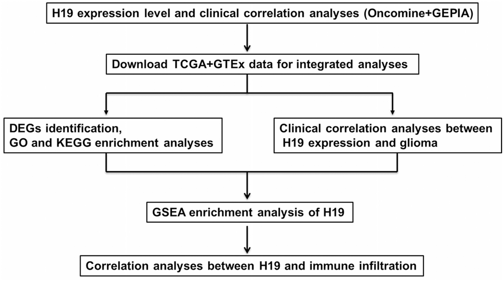 lncRNA H19 was proposed as a regulator in 1990 and was the first lncRNA to be discovered [12]. H19 has been reported to participate in the regulation of a variety of diseases [13], especially in gliomas. Relevant reports exhibited that H19 promoted proliferation and invasion in human glioma cells [14]. H19 interacted with miR-140 to regulate glioma growth [15]. LncRNA H19 promotes tumor growth through its derivative miR-675 in gliomas [16]. Herein, the relationship between the expression level of H19 and glioma was investigated from the perspective of bioinformatics. First, we analyzed the expression of H19 in glioma tissue, the relationship between H19 and glioma patient's clinical characteristics, and the prognostics value of H19 by Oncomine and GEPIA database. Then, TCGA and GTEx data were used to comprehensively analyze the clinical correlations, differentially expressed gene (DEGs), Gene Ontology (GO) and Kyoto Encyclopedia of Genes and Genomes (KEGG) pathways. Finally, gene set enrichment analysis (GSEA) and immune infiltration analysis were performed on H19. The workflow of this study was shown in Figure 1.