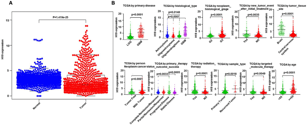 Based on Limma and beeswarm package analyses, we discovered that H19 was clearly up-regulated in gliomas (Figure 10A). Analysis of 667 samples from TCGA exhibited that H19 differential expression was noticeably associated with primary disease, histological type, histologic grade, new tumor event, tumor tissue site, cancer status, primary therapy outcome, radiation therapy, sample type, targeted molecular therapy and age (Figure 10B). Additionally, traits significantly unrelated to the expression of H19 were shown in Supplementary Figure 1. Survival analysis exhibited that low expression of H19 had a better prognosis (Figure 11), which was in line with the result from GEPIA analysis. These results demonstrated that H19 could be used as an indicator of progression and prognosis in patients with glioma, and high H19 expression indicated poor therapeutic effect. However, radiotherapy could upregulate H19 expression, indicating that radiotherapy might not be suitable for patients with glioma.