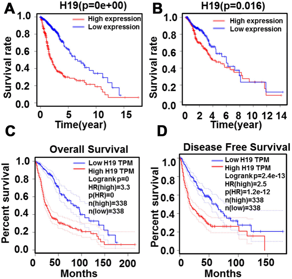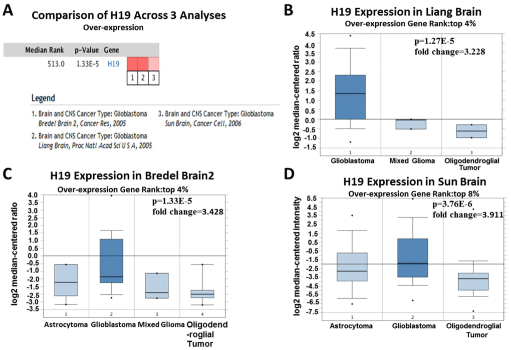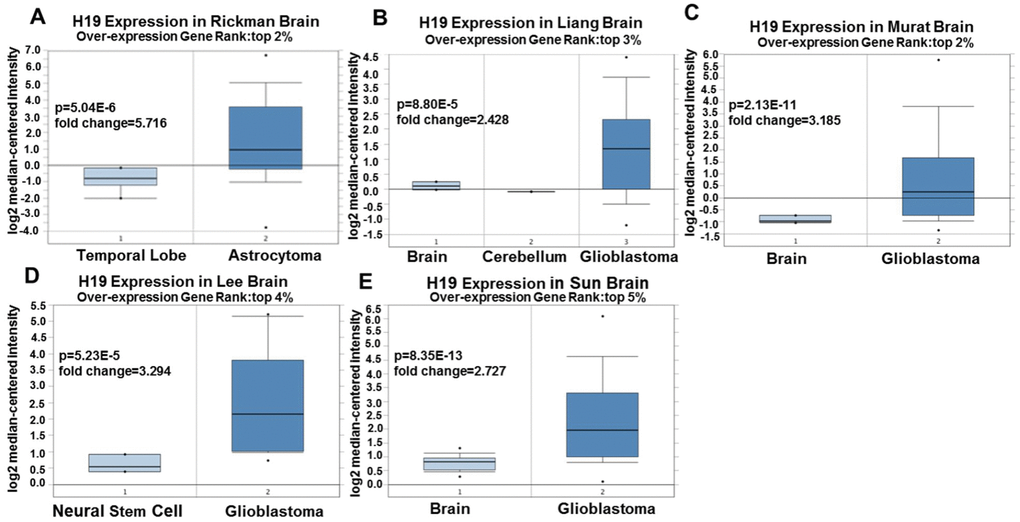 Recently, there have been many reports on the expression and functions of IncRNA H19 in cancers [22–24], including glioma [25]. To our knowledge, the possible prognostic value of H19 in gliomas remains largely to be explored and the underlying role of H19 in gliomas is the focus of this current study. As reported in related literature, H19 has a high expression in glioma tissues [16, 26]. In the present study, we found that H19 was highly expressed in glioma tissues by Oncomine database analyses. The result is consistent with the finding in the previous study, revealing that H19 might act as a crucial regulatory role in glioma progression. In addition, it was found that the expression of H19 increased with the increase of malignancy in the clinic correlation analyses, which was also confirmed in another study [27]. The result unearthed that H19 might sever as a possible molecular marker for predicting the degree of glioma malignancy.