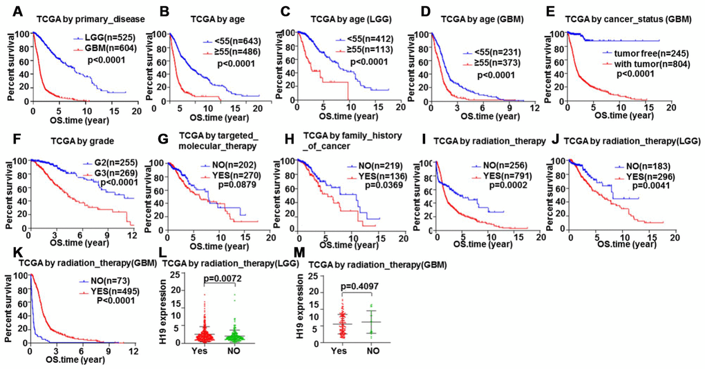 In order to further verify the above inferences, survival analysis was conducted on 1148 glioma patients (LGG and GBM) by Kaplan-Meier plotter. We discovered that patients with LGG had a longer overall survival than those with GBM (Figure 12A, P<0.05). Patients younger than 55 have a longer survival time than those older than 55 (Figure 12B–12D, P<0.05). The tumor-free survival time was longer than that with tumor (Figure 12E, P<0.05). Patients with grade 2 had a longer survival time than patients with grade 3 (Figure 12F, P<0.05). Targeted molecular therapy was not correlated with survival time (Figure 12G, P>0.05). Patients without a family history of cancer had a longer survival than those with a family history of cancer (Figure 12H, P<0.05). Patients without radiotherapy have a longer survival time than patients with radiotherapy (Figure 12I, P<0.05), which was consistent with that in LGG patients, whereas patients who received radiotherapy in GBM patients had a longer survival time than those who did not (Figure 12J, 12K, P<0.05). Meanwhile, we found that the expression level of H19 in patients who received radiotherapy in LGG was higher than those who did not (Figure 12L, P<0.05), and the opposite result was found in GBM, but not statistically significant (Figure 12M, P>0.05). These results exhibited that targeted molecular therapy had no effect on the survival time of glioma patients. Primary disease, age, cancer status, grade and radiation therapy had effects on the prognosis of patients with glioma, and radiation therapy had opposite therapeutic effects on LGG and GBM patients, suggesting that the expression of H19 could act as an indicator molecule.