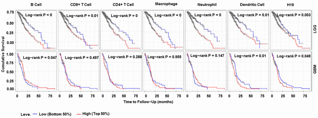 TIMER [52] (https://cistrome.shinyapps.io/timer/) is a comprehensive resource for systematical analysis of immune infiltrates across diverse cancer types. The abundances of six immune infiltrates (B cells, CD4+ T cells, CD8+ T cells, Neutrphils, Macrophages and Dendritic cells) were estimated by our statistical method, which was validated using pathological estimations. This web server allows users to input function-specific parameters, with resulting figures dynamically displayed and makes it convenient to access the tumor immunological, clinical, and genomic features. We used the TIMER “gene” module to analyze the correlations between H19 expression level and glioma immune infiltration level. Kaplan-Meier method was used to analyze the influence of H19 and immune cell infiltration on the prognosis of glioma patients (GBM+LGG). Meanwhile, clinical factors were included to construct a multivariate COX proportional risk model. Finally, SCNA module was used to analyze the relationship between H19 copy number variations in different somatic cells and infiltration level of glioma. The correlations between copy number variations and mRNA level of H19 were analyzed by cBioportal (http://www.cbioportal.org/) [53] database.