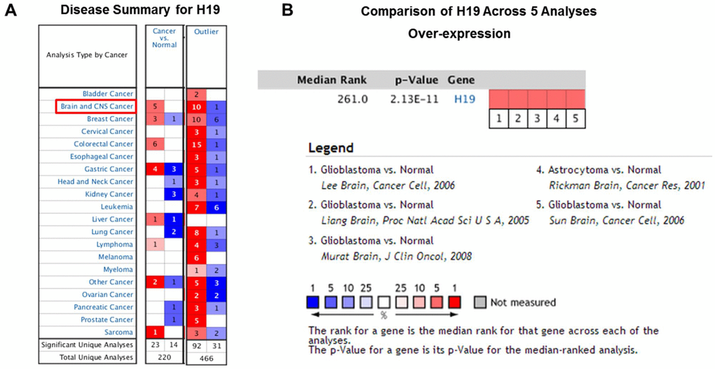 Oncomine (www.oncomine.org), currently the world's largest oncogene chip database and integrated data mining platform, contains 715 gene expression data sets from 86,733 cancer and normal tissues [34]. The expression level of H19 in glioma and its correlations with the degree of glioma malignancy and the clinical characteristics of glioma patients were analyzed in the Oncomine database. This analysis drew on five glioma studies, including Rickman Brain, Liang Brain, Murat Brain, Lee Brain, Sun Brain, and Bredel Brain glioma studies [35–40]. The expression level of H19 in glioma tissues was evaluated relative to that in normal tissue, as well as its expression in tumor tissues with different malignant degrees. P <0.01, Gene Rank