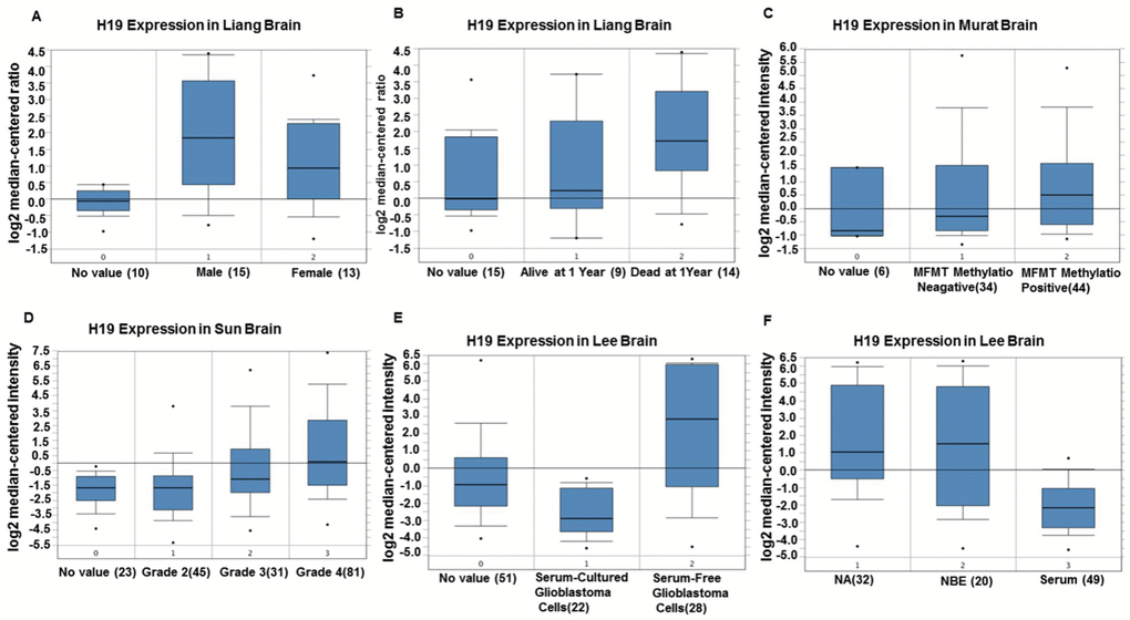 Based on the Oncomine database, we performed a range of correlation analyses between the expression level of H19 and clinical features in glioma patients. The results demonstrated that the expression level of H19 in men was up-regulated compared to that in women (Figure 5A). One year later, the expression level of H19 in living patients was lower than that in the deceased (Figure 5B). The expression level of H19 in patients with negative MGMT methylation was lower than that in patients with positive MGMT methylation (Figure 5C); and H19 expression increased with the increase of stage (Figure 5D). Interestingly, the expression level of H19 in serum-free cultured glioma cells was higher than that in serum cultured ones (Figure 5E, 5F). These results suggested that H19 might be associated with glioma progression.