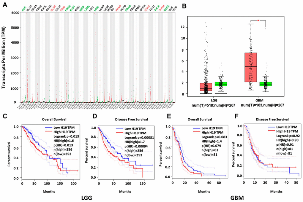 In order to further determine the correlation between H19 expression and gliomas and verify the results from Oncomine analyses, we analyzed GEPIA data and found that H19 was significantly up-regulated in DLBC (Lymphoid Neoplasm Diffuse Large B-cell Lymphoma), GBM (glioblastoma multiforme), PAAD (pancreatic cancer), STAD (gastric cancer), and THYM (Thymoma) (Figure 6A). And it was markedly downregulated in ACC (adrenocortical carcinoma), KIRP (renal papillary cell carcinoma) and LIHC (liver cancer), etc. Interestingly, the expression of H19 showed no significant difference in LGG compared with that in normal control, but was observably upregulated in GBM (Figure 6B). Prognostic analysis revealed that high expression of H19 would lead to a short overall survival and disease-free survival in patients with LGG (Figure 6C, 6DP < 0.05), and the expression level of H19 was not associated with the prognosis of patients with GBM (Figure 6E, 6F, P > 0.05). These results indicated that H19 was conspicuously upregulated in GBM and had prognostic value in LGG, indicating that H19 had important regulatory functions in gliomas.
