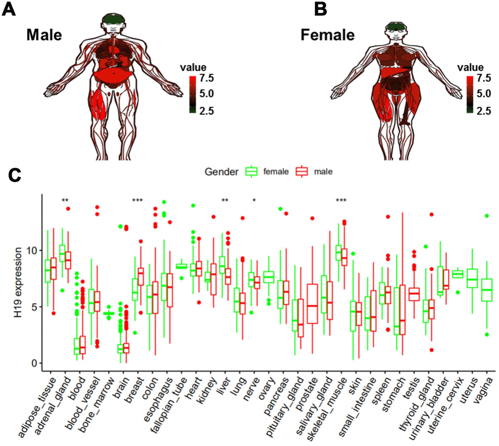 GTEx were downloaded from UCSC Xena project [43] (http://xena.ucsc.edu/). Data was as follows: TOIL RSEM fpkm (n=7,862) and phenotype (n=9,783). The Ensembl number of the gene in RNAseq data was transformed into the Official Symbol of the gene through your own perl [44] script. Then, based on GTEx RNAseq and phenotype data, perl script was used to extract the expression level of H19 in different normal organs of men and women, and visualization was conducted based on GitHub [45] website R package: gganatogram [46] and ggpubr.