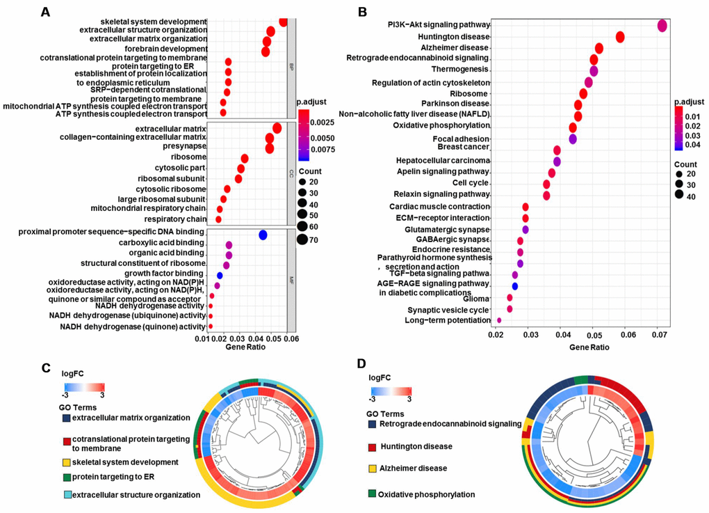 A total of 1,427 DEGs (|logFC|>2, FDR<0.05) were identified in glioma data by differential expression gene analysis (Supplementary Table 1, Figure 8). GO analysis demonstrated that the biological processes of these DEGs were significantly enriched in the development of skeletal system, extracellular structure and forebrain. Cell components were mainly concentrated in extracellular matrix, collagen containing extracellular matrix and ribosomes. Molecular functions were obviously enriched in growth factor composition, ribosome structure composition and organic acid binding (Figure 9A). KEGG pathway analysis revealed that DEGs were mainly concentrated in PI3K−Akt signaling pathway, TGF−beta signaling pathway and tumor-related signaling pathway (Figure 9B). Meanwhile, we conducted cluster analyses of the top GO and pathways (Figure 9C, 9D). The top GO terms were enriched in extracellular matrix organization, cotranslational protein targeting to membrane, skeletal system development, protein targeting to ER, extracellular structure organization. Pathways were enriched in Retrograde endocannabinoid signaling, Huntington's disease, Alzheimer's disease, and Oxidative phosphorylation.