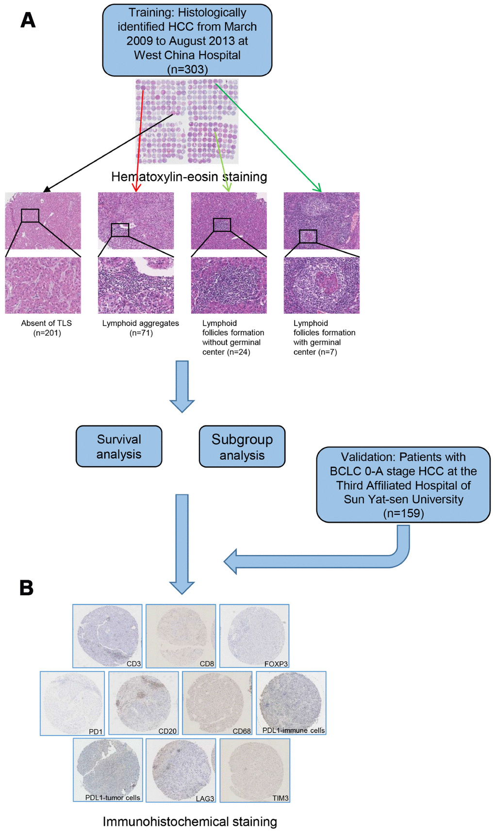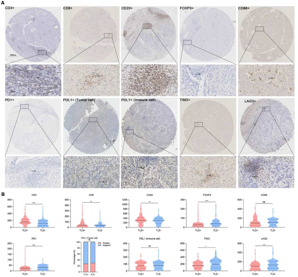 Briefly, HCC tissue specimens were buffered, fixed using formalin, then embedded in paraffin for microarray analysis. Tissue microarrays were prepared as previously described [40, 41]. An experienced pathologist specialized in liver diseases reviewed the tissue arrays after hematoxylin and eosin staining. The existence of tumor-associated tertiary lymphoid structures (TLS) was assessed based on a scale described previously [17, 18, 42]. The TLS were divided into three main grades: lymphoid aggregates, lymphoid follicles formation without germinal center and lymphoid follicles formation with germinal center [18]. As previously described, tumors with at least one observable TLS were defined as intratumoral TLS+, whereas tumors without any observable TLS were defined as TLS- [18].