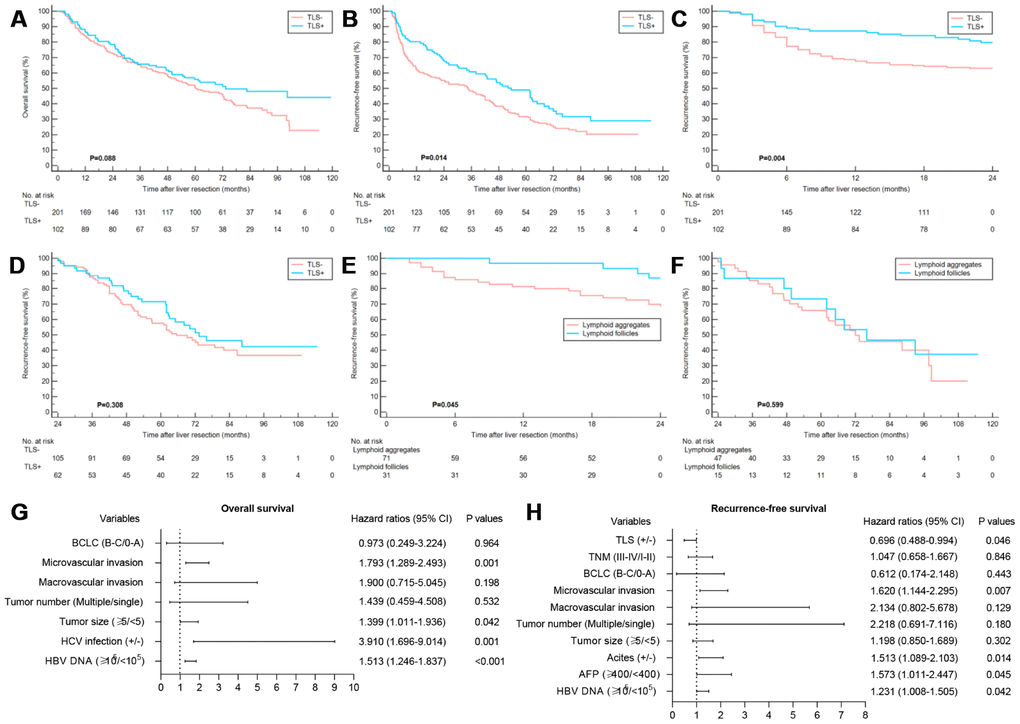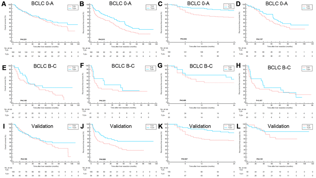 The aim of this study was to confirm the prognostic value of the intratumoral TLS in predicting the relapse of HCC in patients and to investigate its role in the prognosis of HCC patients after curative resection. Overall, the results of the present study showed that the existence and degree of TLS maturation were associated with decreased risk of early HCC recurrence, but this was not linked to OS and late tumor relapse. It is noteworthy that the prognostic value of TLS was limited to BCLC stage 0-A HCC treated with surgical resection. For advanced HCC (BCLC stage B-C), no association was observed between intratumoral TLS and OS or RFS).