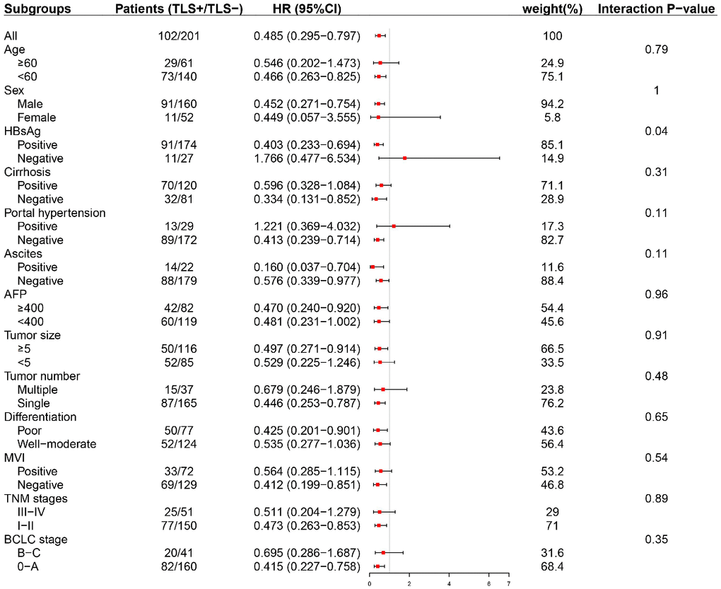 Subgroup analyses were conducted to evaluate the prognostic value of intratumoral TLS in patients stratified by potential sources of heterogeneity. Tumor-associated tertiary lymphoid structures (TLS) had a prognostic effect on early-stage (BCLC 0-A, TNM stage I-II) HCC as well as HCC with solitary nodule (Figure 4 and Supplementary Figures 1–3).