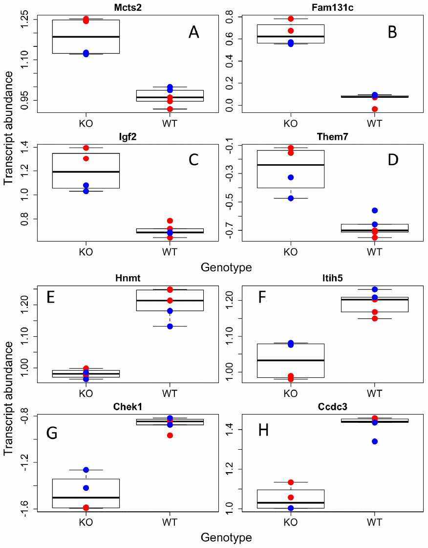 After data filtering and normalization, our final RNAseq data contained information on 9 (4 males (2 KO, 2 WT), 5 females (2 KO, 3 WT) animals and 14683 individual transcripts. Our final metabolomic dataset consisted of information on 12 animals (3 per group) each with data on 1822 and 1763 metabolites in the positive and negative ion mode, respectively. Basic demographic data on all animals used in the study are shown in Supplementary Table 1, and processed transcriptomics and raw metabolomics data can be found in Supplementary Tables 2–4. Raw transcriptomics data have been submitted to GEO, accession GSE143672.