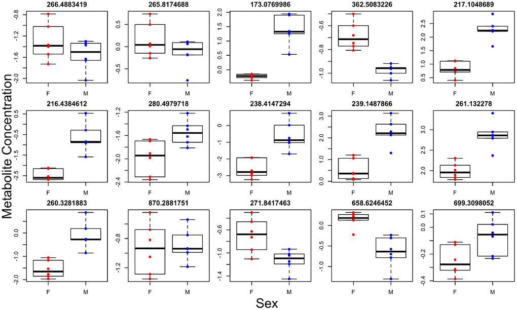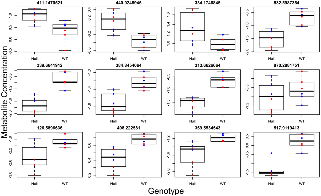 Metabolite concentrations were log-transformed, and values in each sample were centered and scaled to a mean of zero and a standard deviation of one. Metabolites that were not found in all samples were removed from analysis. Similar to RNAseq analysis, we ran a basic linear model looking at the effects of genotype, sex, and their interaction on metabolite concentration. Metabolites were considered to be associated with a factor of interest at p<0.01. For those metabolites that were found to be significantly different between groups, we attempted to annotate them with a putative identity using mummichog [32]. We were then interested in determining if the entire metabolome was associated with the genetic background of the animals by running unsupervised PCA using the same methods as described in the RNAseq analysis.
