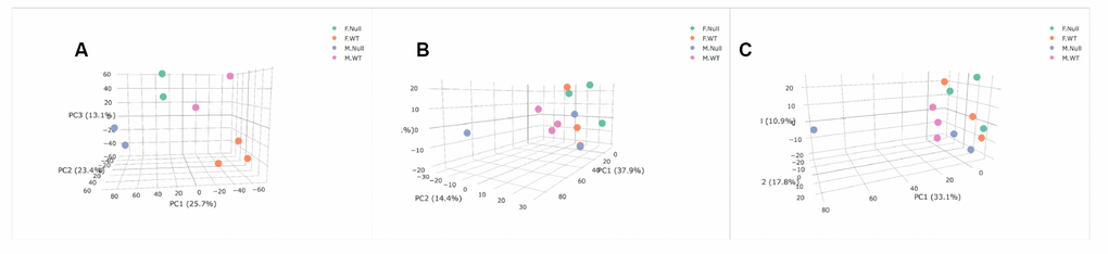 We lastly ran unsupervised Principal Components Analysis (PCA) on both the transcriptomic and metabolomic datasets to determine if either the entire transcriptomes or metabolome were associated with genotype and sex. The BAT transcriptome showed separation of all four groups (Figure 5A). However, in the blood metabolome, sex appears to be a stronger factor delineating the groups with female KO and WT mice more similar to each other than to either group of males (Figure 5B). In the positive ion mode, both genotypes of female mice and GHRH-KO male mice showed similar metabolomic profiles, and only the KO males had different profiles than the other groups (Figure 5C). However, some of these results are due to a strong male KO animal that was an outlier compared to all other individuals. Overall, our PCA results suggest that the BAT transcriptome shows more differences in both genotype and sex than our blood metabolomic analysis, similar to what was seen with individual transcripts and metabolites.