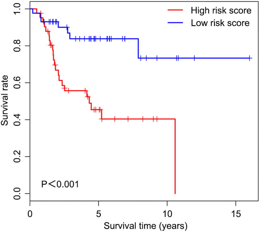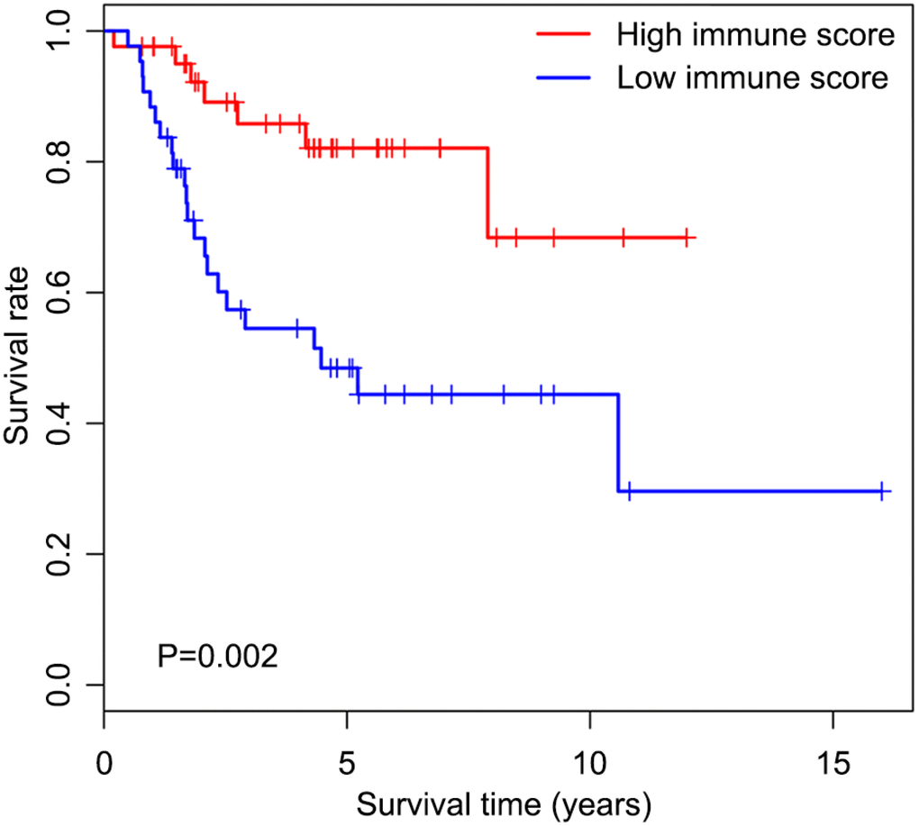We first determined immune score of the normalized matrix data of 85 OS samples with complete clinical data by applying the ESTIMATE algorithm. Subsequently, the OS cases were assigned to the high and low immune score groups respectively, according to the median value of immune scores. Kaplan-Meier curves revealed that the high immune score was significantly associated with improved outcome (P=0.002) (Figure 1). The five-year survival rates in cases with high and low immune score were 82.1% and 48.5%, respectively.