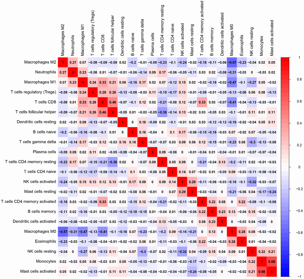 Of all OS samples, 38 and 43 with low and high immune score, respectively, were eligible based on CIBERSORT P<0.05. The two most common TIICs in OS tissues were macrophages and T lymphocytes, which accounted for more than 80% of all TIICs. Specifically, the proportions of naive B cells (Z=-3.014, P=0.003) and M0 macrophages (Z=-3.095, P=0.002) were significantly lower in high immune score tissues compared with the low immune score group, while the proportions of M1 macrophages (Z=-3.047, P=0.002), M2 macrophages (Z=-3.785, P<0.001) and resting dendritic cells (Z=-2.251, P=0.024) were significantly higher (Figure 2). Furthermore, the ratio of M1 macrophages to total polarized macrophages (M1 and M2) showed no significant difference between high and low immune score tissues (Z=-1.427, P=0.154). Correlations among the 22 TIICs ranged from weak to moderate. Obviously, M0 macrophages showed highly negative correlations with M1 and M2 macrophages (Figure 3).