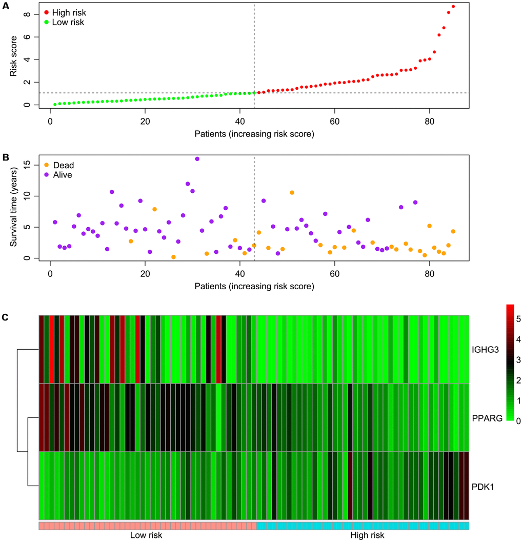 In summary, according to the ESTIMATE algorithm-based immune score that was significantly correlated with improved outcome, 22 TIICs in OS TME were assessed for their levels. Then, a list of immune-related DEGs was extracted, and three such genes (PPARG, IGHG3, and PDK1) were included in a predictive risk model, which could assist clinicians in assessing the prognosis of OS patients and selecting appropriate targets for immunotherapy.