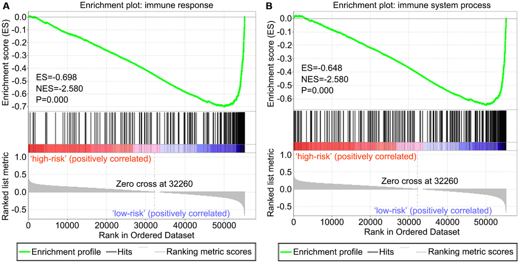 As is calculated by the ESTIMATE algorithm, it is well admitted that elevated immune score is significantly correlated with poor prognosis in clear cell renal cell cancer patients [13]. This aroused our interest in exploring a potential association of immune score with survival in OS patients. To the best of our knowledge, this is the first study building an immune-related risk model to predict outcome in patients with OS by mining the TCGA database. In the present study, we firstly evaluated approximate proportions of TIICs in OS TME, calculating immune score by applying the ESTIMATE algorithm. Importantly, a high correlation was found between the immune score and overall survival in OS patients. It has been demonstrated that TIICs are significantly relevant to the progression and prognosis of OS [18]. In order to explore specific differences in the proportions of TIICs, OS cases were assigned to the high and low immune score groups. Then, the types of TIICs were assessed in both groups of OS tissues with CIBERSOTR. Subsequently, immune-related DEGs were screened between high and low immune score OS tissues, and an optimal immune-related risk model was built by univariate and multivariate Cox regression analyses. In this model, high risk score, calculated by the expression levels of three immune-related DEGs, was associated with poor outcome. Moreover, of these three genes, PDK1 overlapped with the gene signatures found on the CIBERSORT platform, which implied that immune-related risk score and the proportions of TIICs may be somehow associated. Fortunately, correlations of the risk score with the proportions of 5 TIICs were determined in this study. Finally, we applied GSEA to assess the associations of immune pathways with the determined risk score.