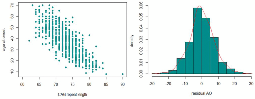 Previously, Genetic Modifiers of Huntington’s Disease (GeM-HD) Consortium carried out a GWA approach of HD individuals to reveal genetic modifiers of AO in HD [9, 10]. A total of eleven [9] and fourteen loci [10] were found to be associated with residual age at HD onset. In the present study, we performed the first GWAS to identify some possible genetic modifiers of AO in MJD. First, we assessed the relationship between AO and size of the expanded (CAGexp) and normal (CAGnor) alleles, biological sex and geographical origin. Next, we determined a residual AO for each subject, which is the difference between the measured AO and the predicted/estimated AO from expanded CAG repeat size alone. Using the residuals as a quantitative phenotype for a GWAS, we looked for genetic factors that modulate AO in MJD.