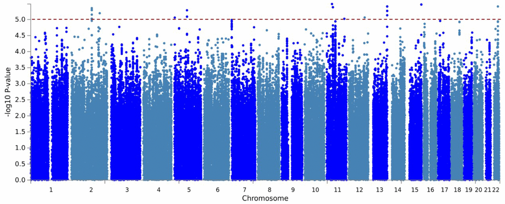 After post-imputation quality assessments, a total of 700 individuals with genotyping information for 6,716,580 variants remained for GWAS. The Manhattan plots are shown in Figure 2. The genomic inflation factor was close to one (λ = 0.98), indicating the p-values were not inflated. Genome-wide suggestive associations (P < 1 × 10−5) with 204 variants across 9 loci were identified (Supplementary Table 3). The most significantly associated SNP at each locus are shown in Table 1. Positional gene mapping aligned SNPs to 17 genes by their genomic location. Fourteen of the 204 variants had a Combined Annotation Dependent Depletion (CADD)-PHRED score higher than the suggested threshold for deleterious SNPs (12.37), arguing the given loci have a functional role [11].