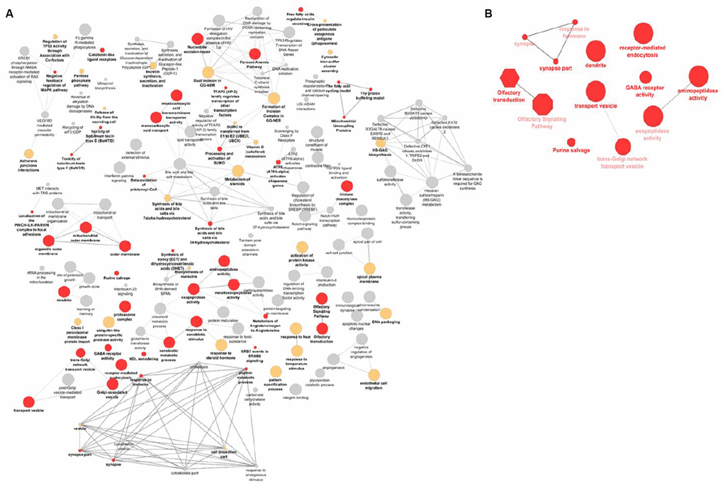 A gene-set enrichment and pathway analysis was conducted using i-GSEA4GWAS v2 [12]. Various approaches and algorithms are currently in use to conduct similar analyses. To be able to make better comparisons with other studies that may use different approaches, we performed a secondary gene-set enrichment and pathway analysis using the VEGAS2 [13] and PASCAL [14] software (Supplementary Tables 5–7). We also used these results for replication purposes in our own study. A total of 13 overrepresented pathways were found, after FDR-multiple testing correction (q-value < 0.05) in the primary GSEA analysis and replicated using at least one of the secondary gene-set enrichment algorithms (Table 2). Overall, the most significantly enriched gene-sets and pathways were vesicle transport, olfactory signaling, and synaptic pathways. Visualization and clustering of pathways are shown in Figure 3.