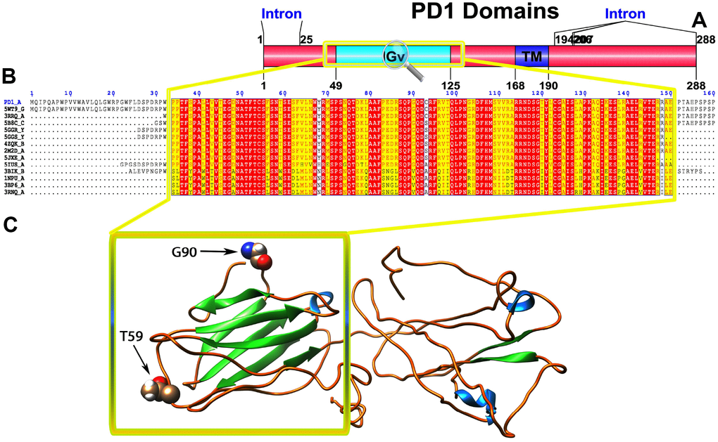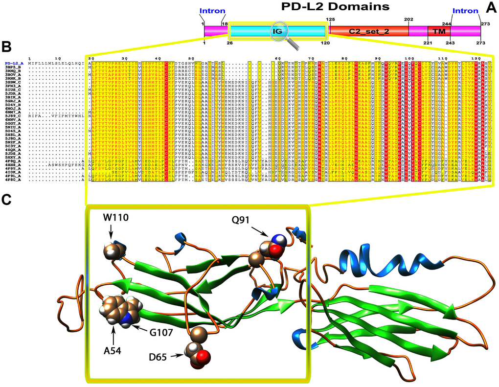 To recognize the domains of these proteins, we used the SMART online tool to predict the protein domains. We identified two domains (Ig-V and TM) in PD1 (Figure 1A), three domains (Ig, Ig-like and TM) in PD-L1 (Figure 2A) and three domains (Ig, C2_set-2 and TM) in PD-L2 (Figure 3A). According to the literature, Ig-like domains are present in various protein families, which are related both in structure and sequence. Ig-like domains contribute to various functions, such as the immune system, cell surface receptors, cell recognition, and muscle structure formation [32]. The V-set domains are Ig-like and resemble the antibody variable region. The V-set domains are present in various protein families, including Ig heavy and light chains; T-cell receptors, such as the cluster of differentiation (CD2, CD4, CD80, and CD86); tyrosine-protein kinase receptors; myelin membrane adhesion molecules; and junction adhesion molecules (JAM) in PD1 [33]. C2-set domains are Ig-like domains that resemble the antibody constant domain and are mainly found in the mammalian T-cell surface antigens CD2, CD4 and CD80 and in intercellular and vascular cell adhesion molecules (ICAMs and VCAMs) [34].