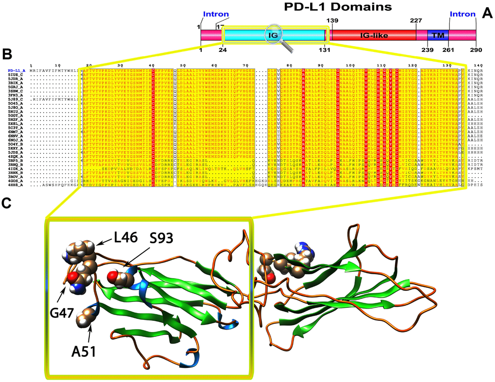 The ConSurf server (consurf.tau.ac.il/) was used to evaluate the evolutionary conservation of amino acid residues of the human PD1, PD-L1 and PD-L2 proteins [83]. The amino acids are more conserved and are essential for protein interactions or are present within more enzymatic pockets than other amino acids of the protein. Therefore, the changes in the conserved amino acids are more lethal than polymorphisms located in flexible regions in a protein because they disrupt the protein function and structure [84, 85]. The conserved amino acids were predicted based on conservation values ranging from 1 to 9; a conservation value between 1–4 is considered variable, a value of 5–6 exhibits average conservation and a value ranging from 7 to 9 indicates very high conservation [86].