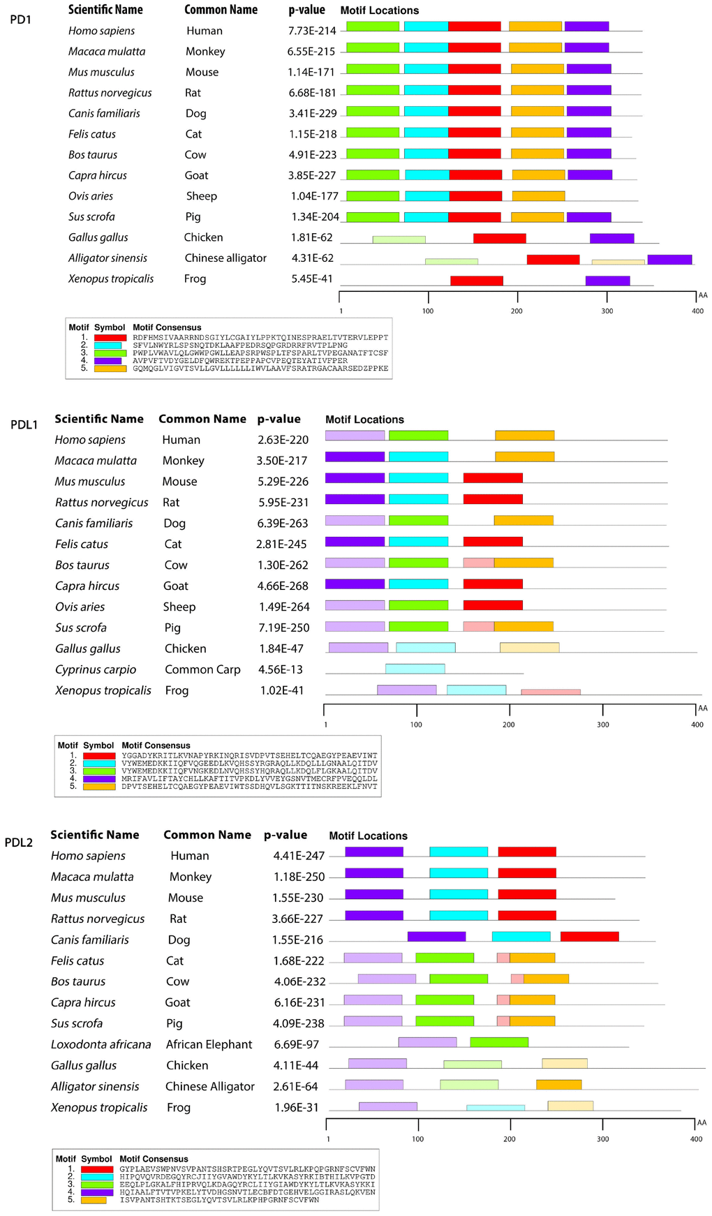 The conserved synteny patterns of the PD1, PD-L1, and PD-L2 genes were determined using the Genomicus v.91.01 [71] and Ensembl [72] databases. We evaluated the conserved synteny for the genomic regions neighboring the PD1, PD-L1 and PD-L2 genes in vertebrate species. The evolutionary novelty of these genes was analyzed by using the Protein Historian program to recognize the taxon of sources of these genes [73]. Conserved syntenies might be linked with gene function and the corresponding gene expression [74, 75]; therefore, we used enrichment analysis to evaluated the biological significance of syntenic genes by searching these genes in various programs: EnrichNet, a network-based enrichment analysis [76], and ConsensusPathDB, a meta-database [77]. EnrichNet detects the genes in specific molecular systems and, using an arbitrary selection, estimates the intervals between the genes and pathways in a reference catalog [76]. ConsensusPathDB is a meta-database that contains an extensive assembly of human molecular interaction data linked to various public sources and has been used for reporting interaction network units and enrichment analyses [78]. The functional motifs and domains of the PD1, PD-L1 and PD-L2 proteins were predicted using the MEME tool (http://meme-suite.org/).