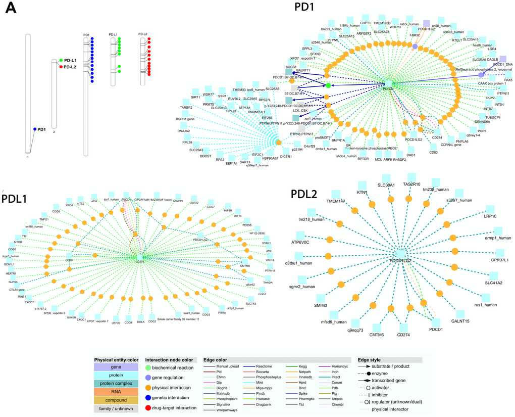 We used EnrichNet, which is a network-based gene enrichment analysis program, and gene IDs from the Ensembl database (PD1; ENSG00000188389, PD-L1; ENSG00000120217, and PD-L2; ENSG00000197646) as queries for the functional network analysis. We used the immune system regulation activity class of the Gene Ontology (GO) functional catalog to map the synteny genes and obtained networks including PD1, PD-L1, and PD-L2 as functionally associated genes (Figure 5). We selected the regulation of the immune response group because it includes the PD1, PD-L1 and PD-L2 genes in most of the functional databases. We expanded our enrichment analysis to various databases and all functional classes by generating functionally linked gene networks in the ConsensusPathDB obtained from the EnrichNet analysis. Using this technique, we identified an interaction network with 107 interactions and 62 unique nodes in the PD1 protein (Figure 5). The interaction between PDCD1 and PTPN6 was maintained through a transcription factor encoded by PTPN, which is the py223 gene that interacts with the PTPN11 and dmbx1 genes (Figure 5). We found 125 interactions and 55 unique nodes physically interacting with the PD-L1 protein (Figure 5). PD-L2 was identified in the conserved synteny map with 56 interactions and 22 distinct nodes, but its function was associated with KTN1, GALNT15 and TMEM147 after the enrichment analysis (Figure 5).