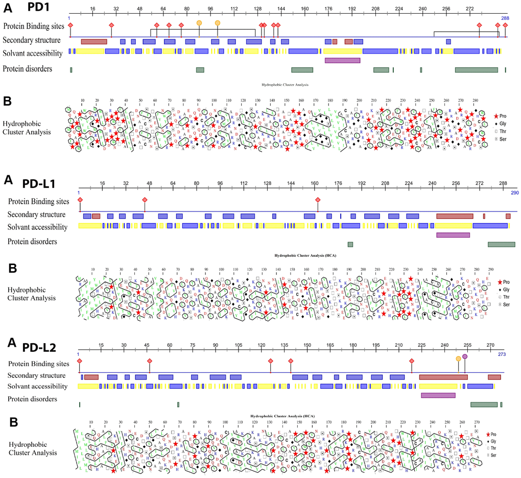 The structures of the PD1, PD-L1 and PD-L2 proteins, including protein-binding positions, solvent accessibility, and disordered structures, were predicted using the Predict Protein server [87]. The secondary structures of the PD1, PD-L1, and PD-L2 proteins were predicted by the CFSSP program [54, 88]. Hydrophobic cluster analysis (HCA) was performed using the HCA 1.0.2 program [89] via the Mobyle@RPBS web portal and framework [90].