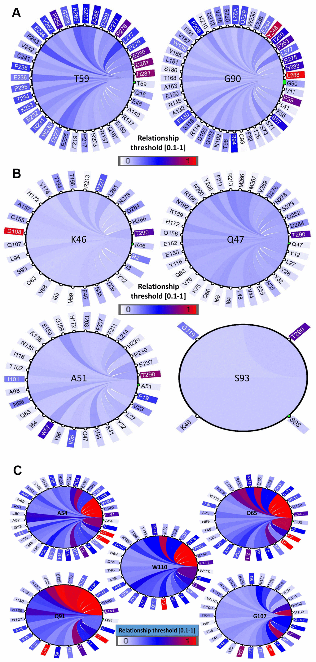 We used a web-based tool (CoeViz) [91] that allows the focused and rapid analysis of protein topographies, such as functional sites and structural domains, and that delivers a variable analysis and visualization of pairwise coevolution of amino acid residues. Full protein sequences of PD1, PD-L1 and PD-L2 were obtained from CoeViz analysis via χ2 covariance metrics [92] and were adjusted for phylogenetic bias in the MSA to predict the maps of covarying residues and the large overlaps with functional regions and the known domains of the protein. The visualization of the residue interactions was improved with circular drawings, and the residues were highlighted in the protein sequences and 3D structures.