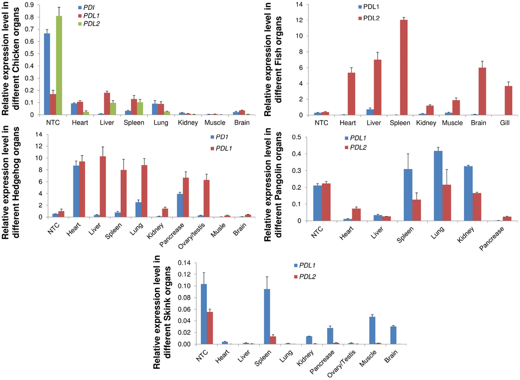 We investigated the mRNA expression patterns of the PD1, PD-L1 and PD-L2 genes in five vertebrate species, including M. javanica, A. albiventris, G. gallus, A. schrenckii and S. crocodilurus. We examined the mRNA expression profiles in heart, liver, spleen, lung, kidney, pancreas, brain, testis, and ovary and muscle tissues from male and female adults. We noticed that PD-L1 had increased expression in almost all species and that PD1 exhibited expression only in chicken tissues. PD-L2 showed increased expression in pangolin and fish in almost all tissues with some exceptions (Figure 8). The expression of PD-L1 was high in almost all tissues, indicating tissue-specific expression. The PD1, PD-L1 and PD-L2 genes were highly expressed in the heart, liver and spleen, indicating their predicted functions in immune development and the prevention of autoimmune disorders in organisms. These PD genes that were highly expressed in vertebrate tissues or organs may have important functions in signaling pathways that play a significant role in autoimmunity, and abnormal signaling in these pathways may result in the loss of peripheral tolerance. Hence, the tissue specificity of the PD genes identified here may be useful sources for further probing their biological functions in immune tolerance at the cellular and molecular levels.