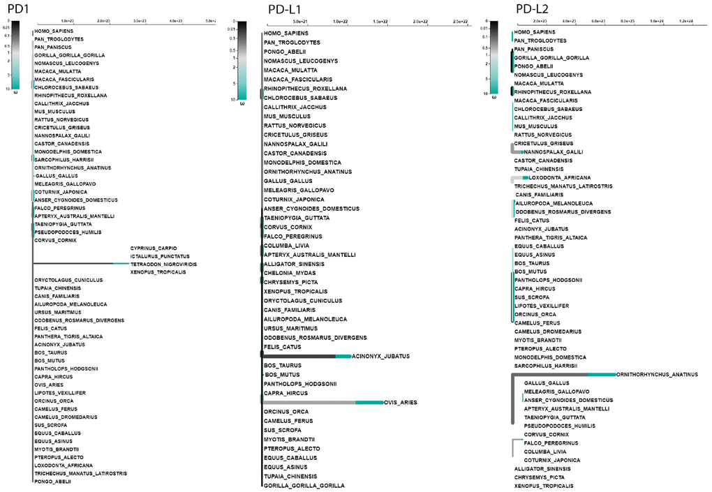 This study was designed to analyze the genomic sequences of programmed cell death-1 and its ligands in vertebrate species to calculate the selection pressure on these genes, which can contribute to adaptive evolution. Our maximum-likelihood phylogenetic analyses of amino acid sequences from 166 vertebrate species revealed that PD1 genes evolved in a shared ancestor of vertebrates. In our study, we selected three genes (PD1, PD-L1, and PD-L2) that are involved in immune tolerance in vertebrates, and we also explored the evolutionary processes, phylogenetic relationships, and resulting structural and functional characteristics of PD1, PD-L1 and PD-L2 homologs in vertebrates. We analyzed the CDS of the PD1, PD-L1, and PD-L2 genes. We identified the orthologs of human PD1, PD-L1, and PD-L2 through a comprehensive BLASTP search approach. We filtered 202, 179 and 181 orthologs for PD1, PD-L1 and PD-L2 genes to retrieve the sequences in vertebrate species. The sequences were omitted if absent in most of the species or absent in two of the three of the main taxonomic groups and had sequences in less than 10 taxa. Secondly, poorly aligned sequences were screened using a sliding-window comparison method. These CDS were compiled into a complete multiple sequence alignment, which was used as the input for both the construction of Bayesian phylogenetic trees and other subsequent analyses.