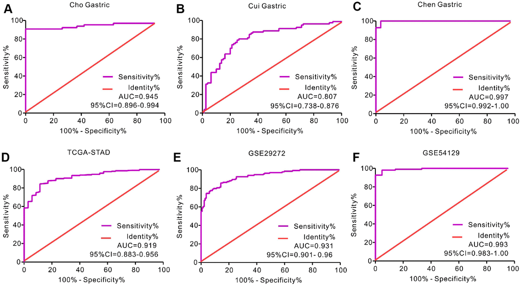 | Chen Gastric | 0.997 | 0.992-1.00 | <0.0001 | -1.435 | 100% | 96.55% |