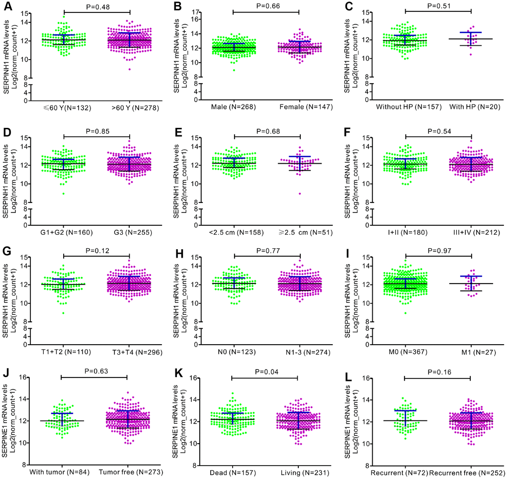 To the best of our knowledge, the present study is the first to explore the clinical significance and molecular function of SERPINH1 in GC. However, our study has several limitations. First, the study cohort of GC patients from our hospital was relatively small. Secondly, we could not analyze the relationship between SERPINH1 and PFS because of lack of PFS data. Moreover, we performed overexpression and silencing of SERPINH1 separately in distinct GC cell lines. These issues need to be addressed in future investigations.