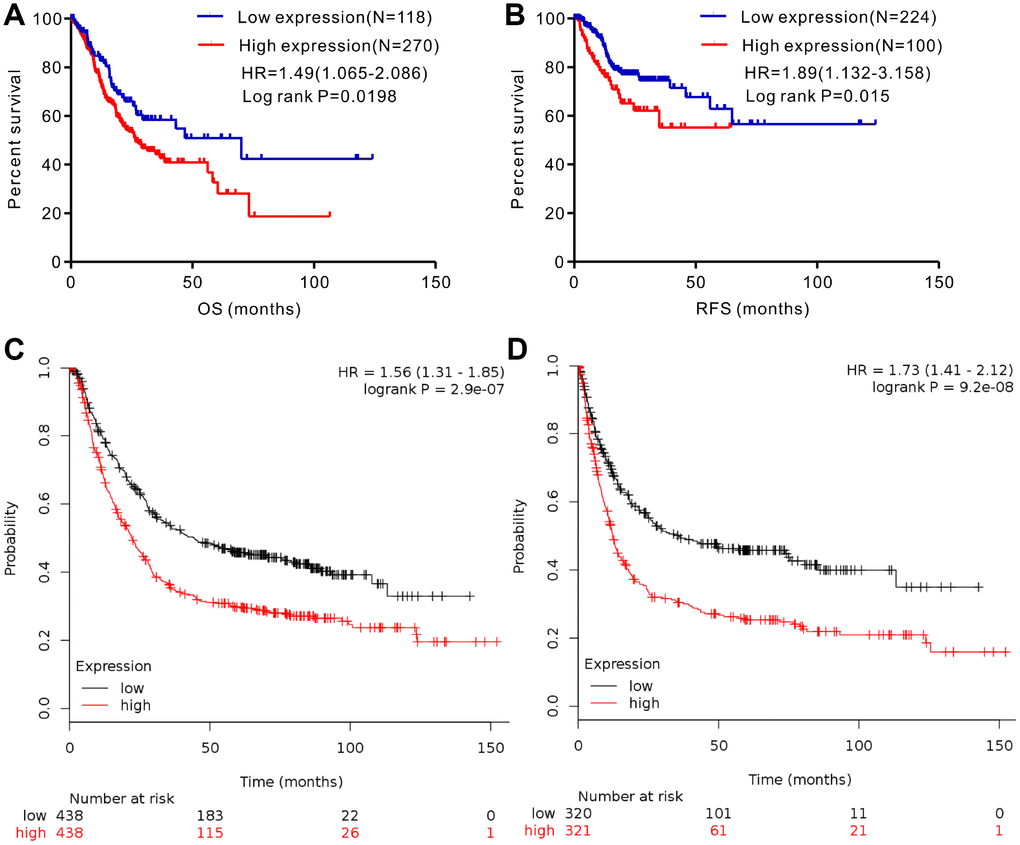 We analyzed gene expression data in the Oncomine (Cho Gastric, Cui Gastric, and Chen Gastric datasets), The Cancer Genome Atlas (TCGA), and Gene expression omnibus (GEO; GSE29272 and GSE54129 datasets) databases to compare SERPINH1 mRNA levels in the tumor and normal gastric mucosal tissues from GC patients (N=888). The GC tissues showed significantly higher SERPINH1 mRNA expression than the adjacent tissues (N=318; Figure 1). Next, we performed ROC curve analysis and found that the SERPINH1 mRNA levels were of significant diagnostic value in all six datasets (Figure 2). We obtained the highest diagnostic value for the SERPINH1 mRNA in the Chen Gastric dataset (AUC=0.997, 95%CI=0.992-1.00) by using a cut-off value of -1.435 (Table 1). Furthermore, correlation analysis using the TCGA-STAD dataset showed that GC patients with high SERPINH1 mRNA levels showed poorer OS rates than those with lower SERPINH1 mRNA levels. Moreover, Kaplan-Meier survival curve analysis of GC patients from the TCGA database (N=388) showed that GC patients with high SERPINH1 mRNA expression were associated with poorer OS (HR=1.49, 95%CI=1.065-2.086, P=0.0198, Figure 4A) and RFS (HR=1.89, 95%CI=1.32-3.158, P=0.015, Figure 4B) than GC patients with low SERPINH1 mRNA expression. We confirmed the prognostic significance of SERPINH1 by analyzing GC patients from the GEO datasets using the Kaplan Meier-plotter database [17]. The results showed that GC patients with high SERPINH1 mRNA levels were associated with poorer OS (HR=1.56, 95%CI=1.31-1.85, P<0.0001, Figure 4C) and PFS (HR=1.73, 95%CI=1.41-2.12, P<0.0001, Figure 4D) than the GC patients with low SERPINH1 expression.