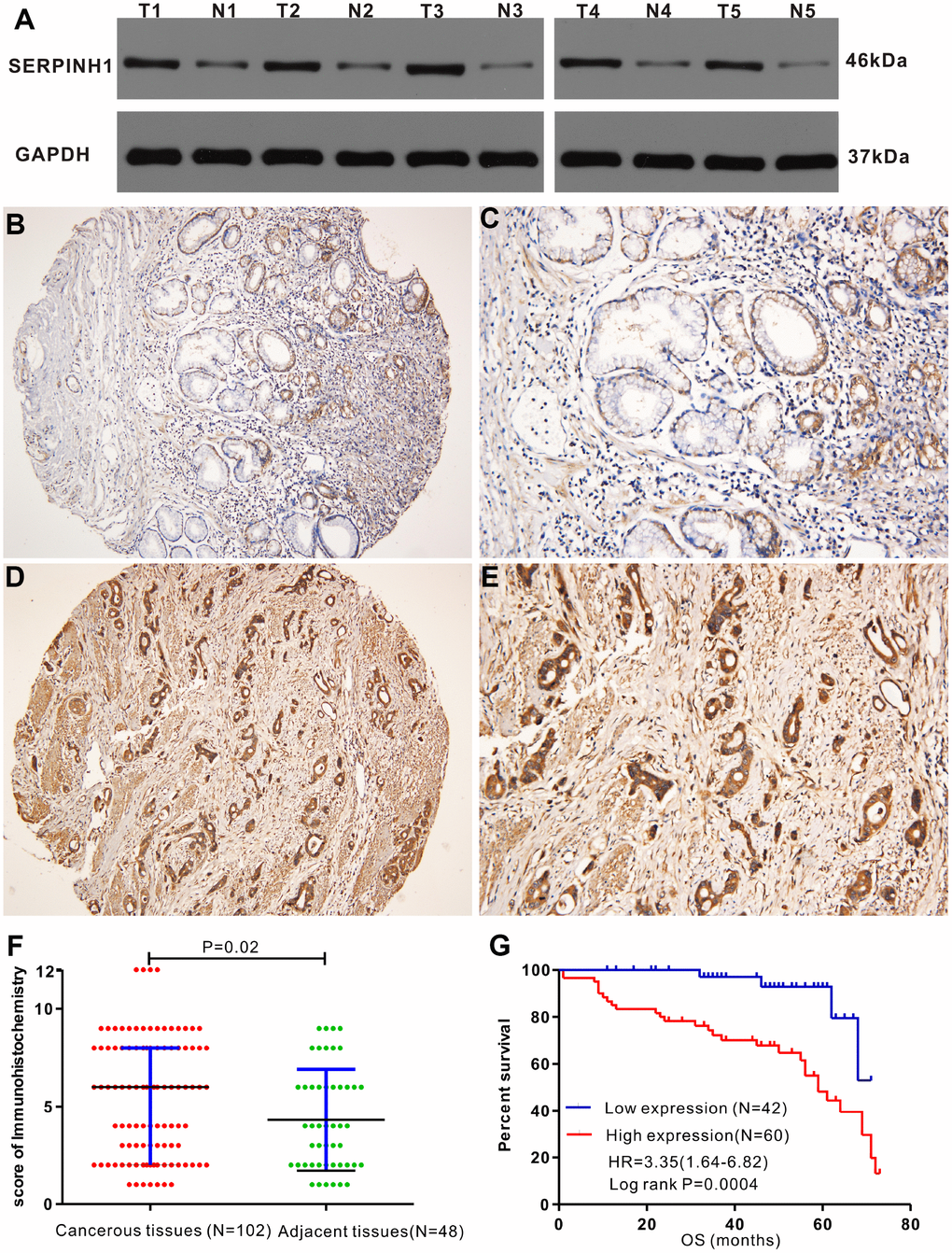 Western blot analysis showed that SERPINH1 (HSP47) protein levels were significantly higher in 5 matched GC tissues compared with the adjacent normal gastric mucosal tissues (Figure 5A). IHC analysis of 102 GC specimens showed that cytoplasmic expression of SERPINH1 was significantly higher in the GC tissues compared with the non-cancerous gastric mucosal tissues (Figure 5B–5E). As shown in Figure 5F, positive SERPINH1 protein staining was significantly higher in the GC tissues than in the adjacent normal gastric mucosal tissues (X2=8.485, P=0.004); high SERPINH1 protein levels were observed in 16 out of 48 normal adjacent gastric mucosal tissues (30%) compared with 60 out of 102 GC tissue samples (58.82%; Figure 5F).