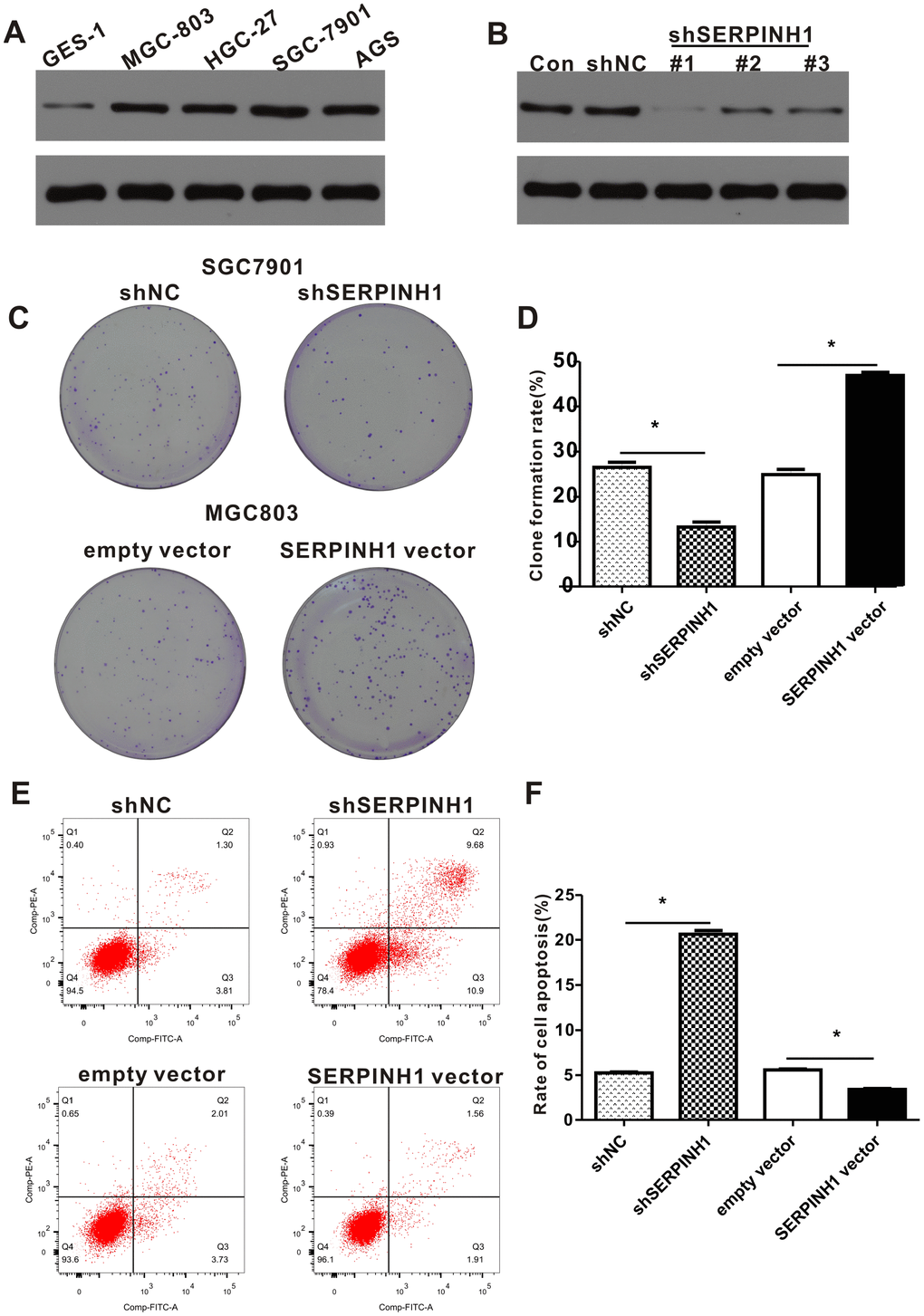 We investigated the role of SERPINH1 levels in GC by transfecting SERPINH1-specific shRNAs to downregulate SERPINH1 in SGC-7901 cells and transfecting SERPINH1-overexpression vector to enhance SERPINH1 levels in MGC-803 cells. Western blot analysis showed that SGC-7901 cells transfected with shSERPINH1 #1 showed significant SERPINH1 downregulation compared to SGC-7901 cells transfected with shSERPINH1 #2, #3, and shNC (Figure 6B). Therefore, we selected SGC-7901 cells transfected with shSERPINH1 #1 for further experiments. SERPINH1-silenced SGC-7901 cells showed significantly reduced number of colonies compared with the control (Figure 6C, 6D). Conversely, SERPINH1-overexpressing MGC-803 cells showed significantly higher number of colonies than the controls (Figure 6C, 6D). The SERPINH1-silenced SGC-7901 cells showed significantly higher rate of apoptosis than the control SGC-7901 cells, whereas, the SERPINH1-overexpressing MGC-803 cells showed significant reduction in apoptosis than the control MGC-803 cells (Figure 6E, 6F). These data demonstrate that SERPINH1 upregulation promotes proliferation and survival of GC cells.