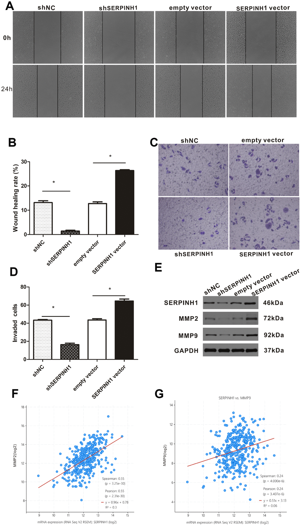 The expression of matrix metalloproteinases (MMP) correlates with the migration potential of cancer cells [18]. Therefore, we analyzed the expression of MMP2 and MMP9 in SERPINH1-overexpressing MGC-803, SERPINH1-silenced SGC-7901, and their corresponding controls. Western blot analysis showed that MMP2 and MMP9 levels were significantly reduced in the SERPINH1-silenced SGC-7901 cells, and significantly increased in the SERPINH1-overexpressing MGC-803 cells compared with their corresponding controls (Figure 7E). Furthermore, gene expression analysis of the TCGA-STAD dataset using the cBioPortal website showed that SERPINH1 mRNA expression significantly correlated with MMP2 (Pearson r=0.55, P<0.0001, Figure 7F) and MMP9 (Pearson r=0.24, P<0.0001, Figure 7G) mRNA levels. Overall, these data show that SERPINH1 expression regulates migration and invasion of GC cells.