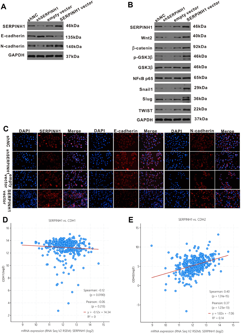 We fixed the cells by incubating in 4% PFA solution (AS1018, Aspen, Wuhan) for 30 min. Then, after blocking the fixed cells with 10% BSA (10735078001, Roche) at 37 °C for 30 min, they were incubated at 4 °C overnight with the following primary antibodies: anti-SERPINH1 (ab109117, Abcam); anti-E-cadherin (20874-1-AP, San Ying, Wuhan); and anti-N-cadherin (Abcam, Ab18203). Then, the cells were incubated with CY3- or FITC-conjugated goat anti–mouse or goat anti–rabbit IgG (AS-1111, Aspen, Wuhan) at 37 °C for 1 h. The cells were imaged and analyzed under a fluorescence microscope.