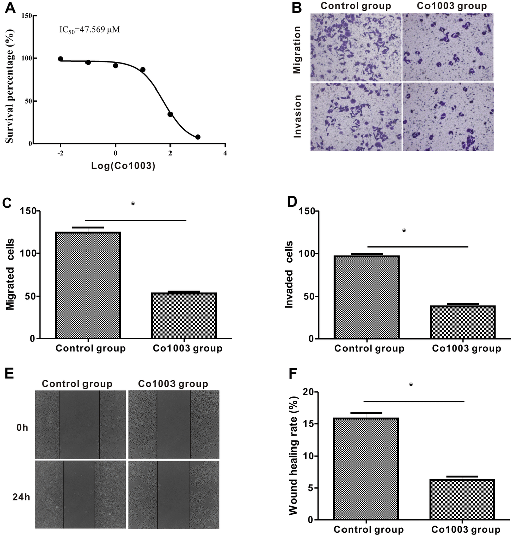 Finally, we analyzed the anti-tumor effects of Col003, a small molecule inhibitor of the SERPINH1 protein. We incubated SGC-7901 cells in medium containing different concentrations of Co1003 (0, 0.01, 0.1, 1, 10, 100, 1000 μM) for 24h, and analyzed the cell viability using the CCK-8 assay. The results showed a concentration-dependent reduction of SGC-7901 cell viability by Col003 comparison with the DMSO-treated control SGC-7901 cells (Figure 9A). The IC50 of Col003 was 47.57 μM, and this concentration for further experiments. Transwell migration and invasion assay showed that Col003 significantly decreased migration and invasiveness of SGC-7901 cancer cells compared with DMSO-treated control SGC-7901 cells (Figure 9B–9D). Wound healing assay showed that inhibition of SERPINH1 protein with Col003 in SGC-7901 GC cells significantly reduced their migration compared with the control cells (Figure 9E, 9F). These results demonstrate that Col003 inhibits viability, migration, and invasion of GC cells, and is a promising therapeutic target for GC