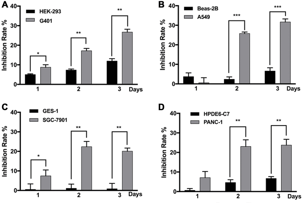 All tumor cell lines used in this study were anaplastic cells derived from highly malignant cases, and non-malignant cell lines derived from the corresponding normal tissues were used in comparison. Most cell lines responded to MF exposure; however, compared with the non-malignant counterparts, the tumor cells were more susceptible to MF-induced inhibition. In Figure 1, on day 1 after 2 h of exposure, inhibition rate in nephroblastoma G401, lung epithelial cancer A549, gastric cancer SGC-7901, and pancreatic cancer PANC-1 was all significantly higher than the corresponding normal cell lines. Inhibition persisted to day 2 and 3, with accumulated MF exposure for 4 and 6 hours respectively. Peak inhibition rates of 20-30% were achieved: 29% in G401 on day 3, 30% in A549 on day 3, 22% in SGC-7901 on day 2, and 24% in PANC-1 on day 3. The most MF-sensitive normal cell line was human embryonic kidney cell HEK293, in which peak inhibition was 12% on day 3 (Figure 1A), while gastric epithelial cell GES-1 remained totally resistant to MF exposure (Figure 1C). It is noted that in the repeated experiments performed in this project, tumor inhibition on exposure day 1 was not always significant, due to the sometime high data deviation. However, same trend of MF-induced inhibition was constantly observed on day 1. Tumor inhibition on exposure day 2 and 3 was always significant since higher inhibition rates had been achieved.