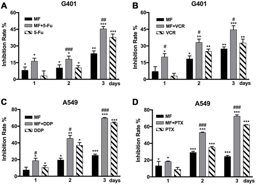 MF was used in combination with two types of chemotherapeutic drugs, antimetabolites that interfere with synthesis of nucleic acids including 5-fluorouracil (5-FU) and cisplatin (DDP), as well as antimitotic drugs targeting the microtubule including vincristine (VCR) and paclitaxel (PTX). MF exposure could sensitize G401 cells to 5-FU and VCR treatments (Figure 2A, 2B), and to DDP and PTX in A549 cells (Figure 2C, 2D). Significant sensitization effect was observed from either day 1 or day 2, and continued to day 3. Combination of MF with chemotherapy increased cell inhibition rates compared with the sole use of either MF or individual drugs, although no synergy or superimposition effect was observed in these experiments.