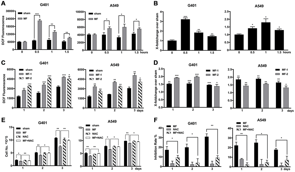 Elevation of ROS levels was found after short-term MF exposure in both G401 and A549 cells, significant from 30 min, and reached the peak at 30-60 min (Figure 3A, 3B). In G401 cells, ROS level increased about 3 folds in 30 min (Figure 3B). Furthermore, the elevation persisted to the next day, even after exposure had been terminated for 24 h (Figure 3C, 3D). The free radical scavenger N-acetyl-cysteine (NAC, > 0.5 mM) could alleviate but could not eliminate MF-induced ROS production (Supplementary Figure 1). Use of NAC (1 mM) decreased the inhibitory effect of MF in G401 and A549 cells (Figure 3E, 3F), albeit cell growth was not completely restored.