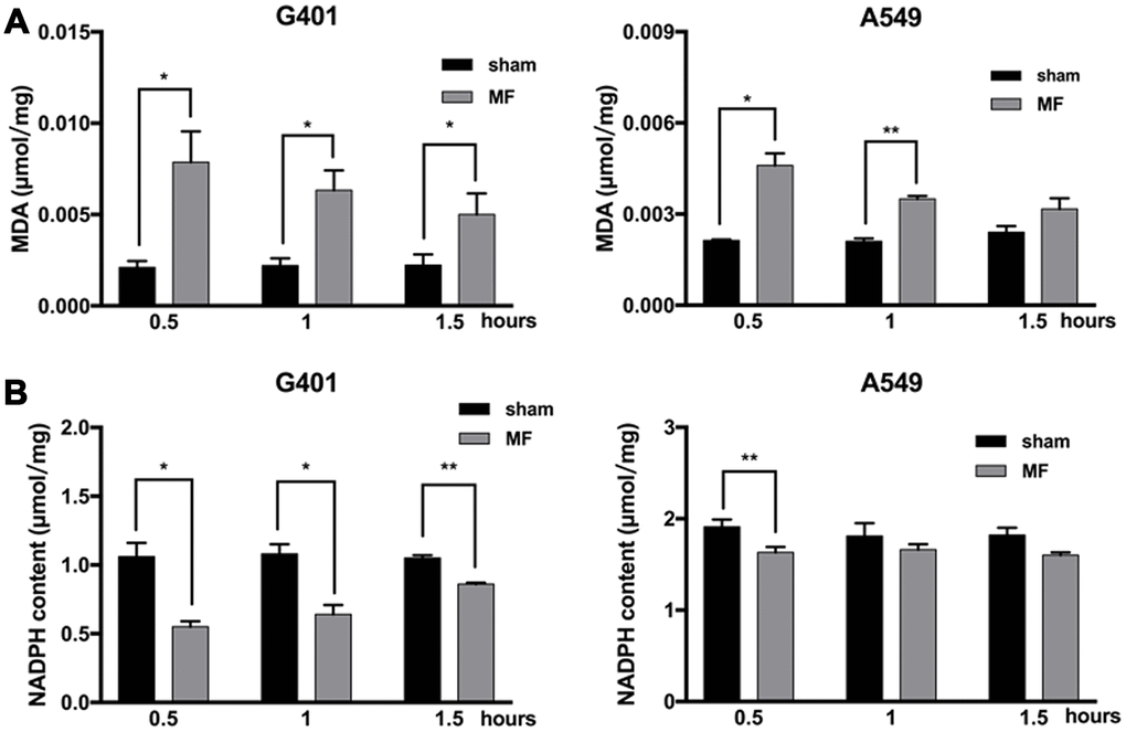Malondialdehyde (MDA), an end product of lipid peroxidation and a common marker for ROS-related cellular injuries, especially for cell membranes, was found to be increased in G401 cells, at 0.5, 1 and 1.5 h after MF exposure, and reaching the peak at 0.5 h as 3.7 times higher than the basal level from the control group. In A549 cells, MDA level increased at 0.5 h and 1 h of exposure, and reaching the peak at 0.5 h as 2.2 times higher than the basal level (Figure 4A). On the other hand, NADPH, a reducing molecule that serves as a major reservoir of the intracellular antioxidant defense, was found to be decreased in both G401 and A549 following exposure (Figure 4B). In G401, NADPH level decreased at 0.5, 1 and 1.5 h, with a reduction of nearly 50% at 0.5 h. In A549 cells, decrease of NADPH was not as pronounced. A significant reduction of about 15% was observed at 0.5 h, and regular level was restored shortly afterwards. In summary, increase of MDA and decrease of NADPH indicated that MF disturbed the cellular redox balance and induced oxidative stress.