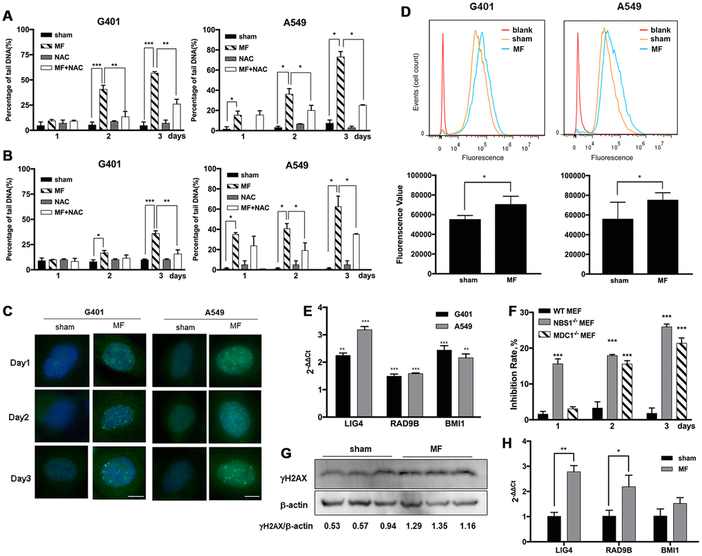 Alkaline Comet assay detects both single and double strand breaks (SSB and DSB) of DNA, and neutral Comet assay detects DSB only. In G401 and A549 cells, MF induced pronounced SSB and DSB on both day 2 and day 3, as indicated by increase in percentage of DNA in the tails detected by alkaline and neutral Comet assays (Figure 5A and 5B). On day 3 in G401 cells, statistically more DNA damage was detected by alkaline Comet assay (57% of tail DNA) compared with those detected by neutral Comet assay (36%), suggesting DSB to be the more dominating type of damage. Similar phenomenon was observed in A549 cells, with 73% of the cells with DSB and 62% with SSB. DNA damage was also confirmed by detection of partial incorporation of 5-ethynyl-2'-deoxyuridine (EdU) into the cell nuclei shown in Figure 6B. In both cell lines, from exposure day 2, the amount of cells with pronounced DNA damage and repair was significantly higher compared with sham exposure, and the same on day 3 (Figure 6B, Supplementary Figure 4). Meanwhile, γH2AX, a marker of DNA damage and activation of the homologous recombination DNA DSB repair pathway at the early stage, was recruited to the nuclei of both G401 and A549 cells shortly after exposure (Figure 5C). By flow cytometry analysis, DNA-PKcs, another protein mediating the nonhomologous end- joining DNA DSB repair pathway, was also found to be increased on exposure day 2 in G401 and A549 cells (Figure 5D). Expression levels of several genes involved in the DNA repair pathways, LIG4, RAD9B and BMI1, were increased in both G401 and A549 cells to different extent (Figure 5E). Furthermore, use of ROS scavenger NAC rescued most of the forementioned DNA damage (Figure 5A, 5B). In Supplementary Figure 2, morphology of nuclei and tail DNA by direct imaging of the gels are presented.