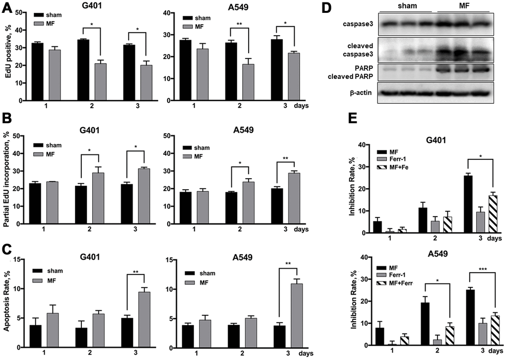 Proliferation rate in G401 and A549 cells, indicated by ratio of EdU positive nuclei, decreased about 10% on exposure day 2, and similar on day 3 (Figure 6A, Supplementary Figure 4). Cell apoptosis rate was significantly increased, but for less than 10% (Figure 6C). MF-induced apoptosis in vivo was also examined in G401 tumor tissues from nude mice. Cell apoptosis markers, cleaved caspase 3 and cleaved PARP, were significantly increased upon exposure (Figure 6D). Induction of ferroptosis was analyzed by use of a specific inhibitor, ferrostatin-1(Fer-1), which partially reduced the antitumor effect induced by MF exposure (Figure 6E). In G401, on exposure day 3, growth inhibition declined from 26% to 17% when Fer-1 was used. Similarly, in A549 cells, Fer-1 reduced the inhibition rate from 25% to 13% on day 3.