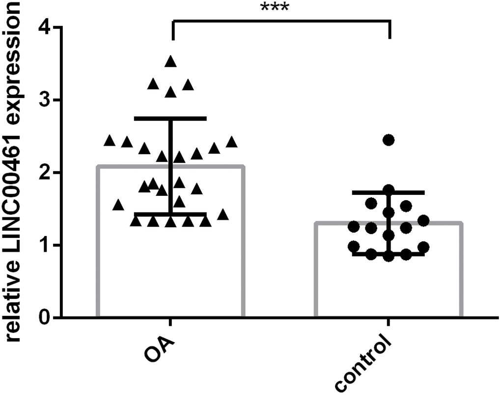 Furthermore, we tested whether the expression of LINC00461 was deregulated in OA and whether LINC00461 expression was decreased in OA cases and normal control patients. We demonstrated that LINC00461 expression was higher in OA tissues than in normal samples (Figure 2, ***p<0.001).